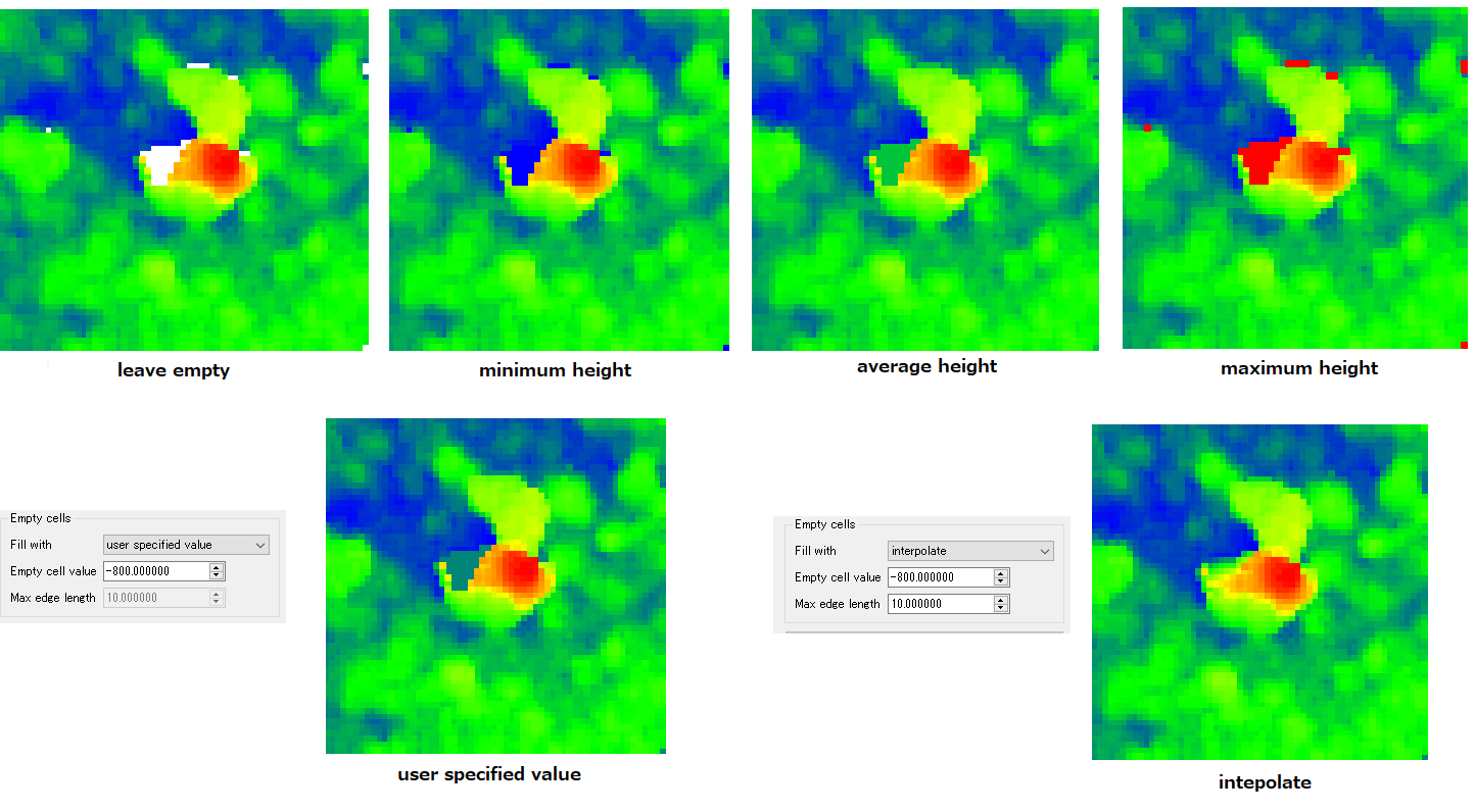interpolate以外の設定では、同一の値で空白部が塗りつぶされています。minimum, average, maximumについては、ラスタライズ後のデータ点群の全てのZ値から算出された最小値、平均値、最大値がセットされます。user specified valueはユーザーがempty cell value に入力した値がそのまま使用されます。