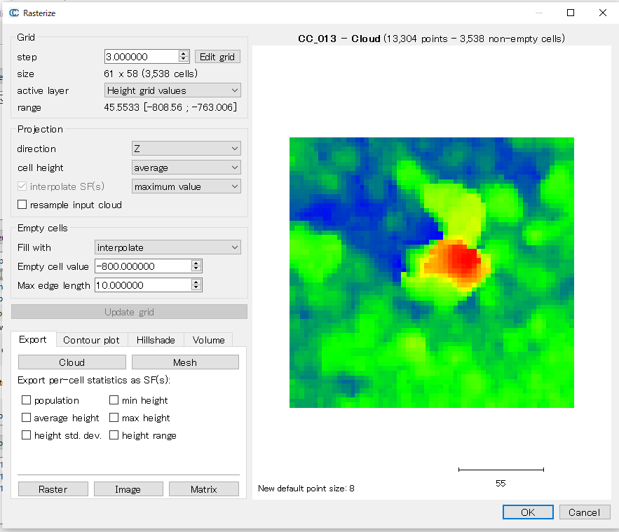 等高線を作成するにはまず、点群データをラスタライズする必要があります。Grid、Projection、Empty cells の各設定値を下記のとおり設定し、「Update Grid」をクリック⇒高さに応じて色付けされたラスタライズ画像が表示されます。(ラスタライズの手順や設定値の詳細は、前回「CC_12 CloudCompareのRasterize機能(ラスタライズその1-点の集約・補完)」をご参照ください。)