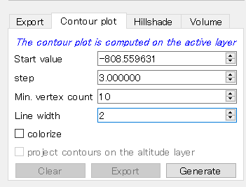 上図の通り設定値を入力し、「Generate」ボタンをクリック⇒ライスタライズ画像上に等高線が表示されます。