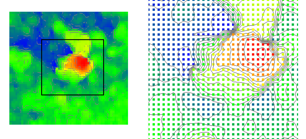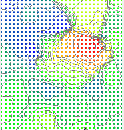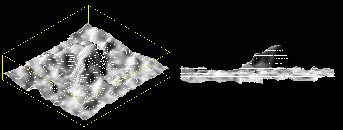 上図左は表示時の画像、上図右はマウスホイール等で中央部分を拡大表示したものです。高さ情報に沿って等高線が作成されているのが見て取れます。