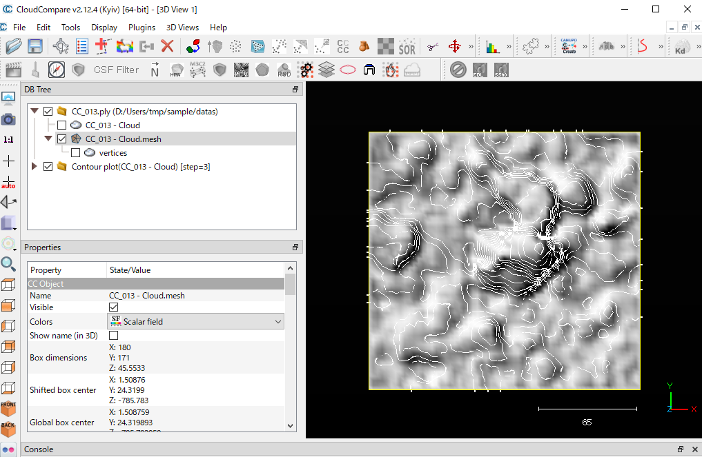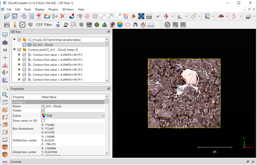 等高線作成をテストするためのサンプルデータを用意しました(CC_013.ply)。このページ下部のリンクからダウンロードできます。CloudCompareを起動後、CC_013.ply を3Dビュー上にドラッグアンドドロップしてください。
