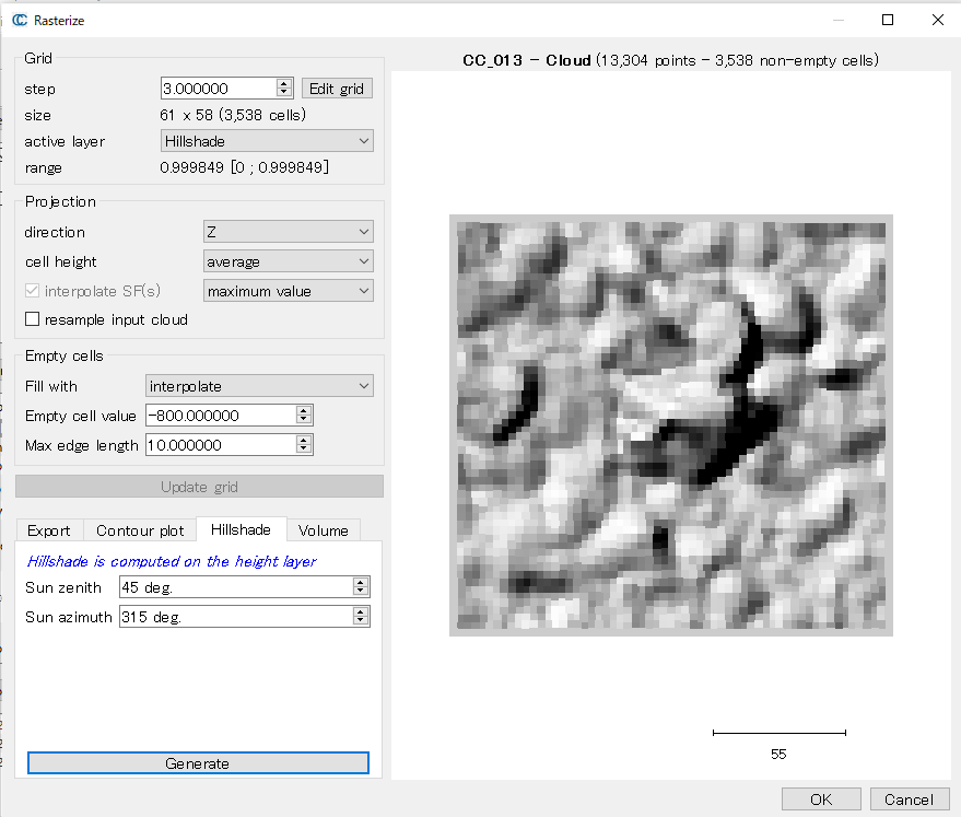 「Update Grid」ボタンの下方にあるタブから、「Hillshade」を選択、設定等は変えずにそのまま「Generate」ボタンをクリックしてください。