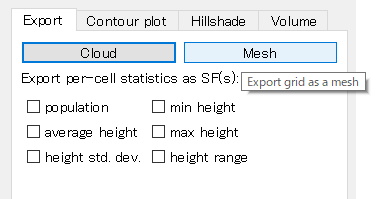 この状態でメッシュを出力することができます。「Hillshade」タブの2つ左にあるタブ「Export」をクリックし、「Mesh」ボタンをクリック⇒メッシュが出力されます。ラスタライズ設定画面右下隅の「OK」ボタンをクリックして設定画面を閉じると、3Dビュー上に陰影つきメッシュが表示されています。